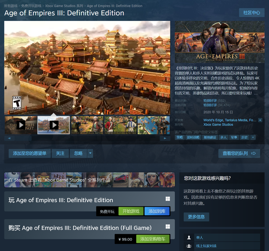 Steam游戏平台《帝国时代3:决定版》标准版现已免费