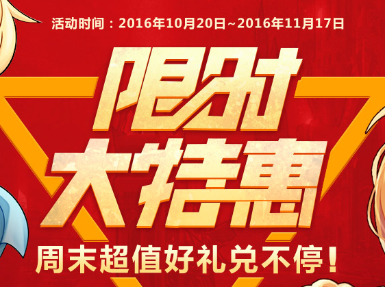 温馨提示:11月17日维护后周末限时大特惠活动将会下架,八种特惠之心兑换的礼盒也会删除,请及时使用或是交易。