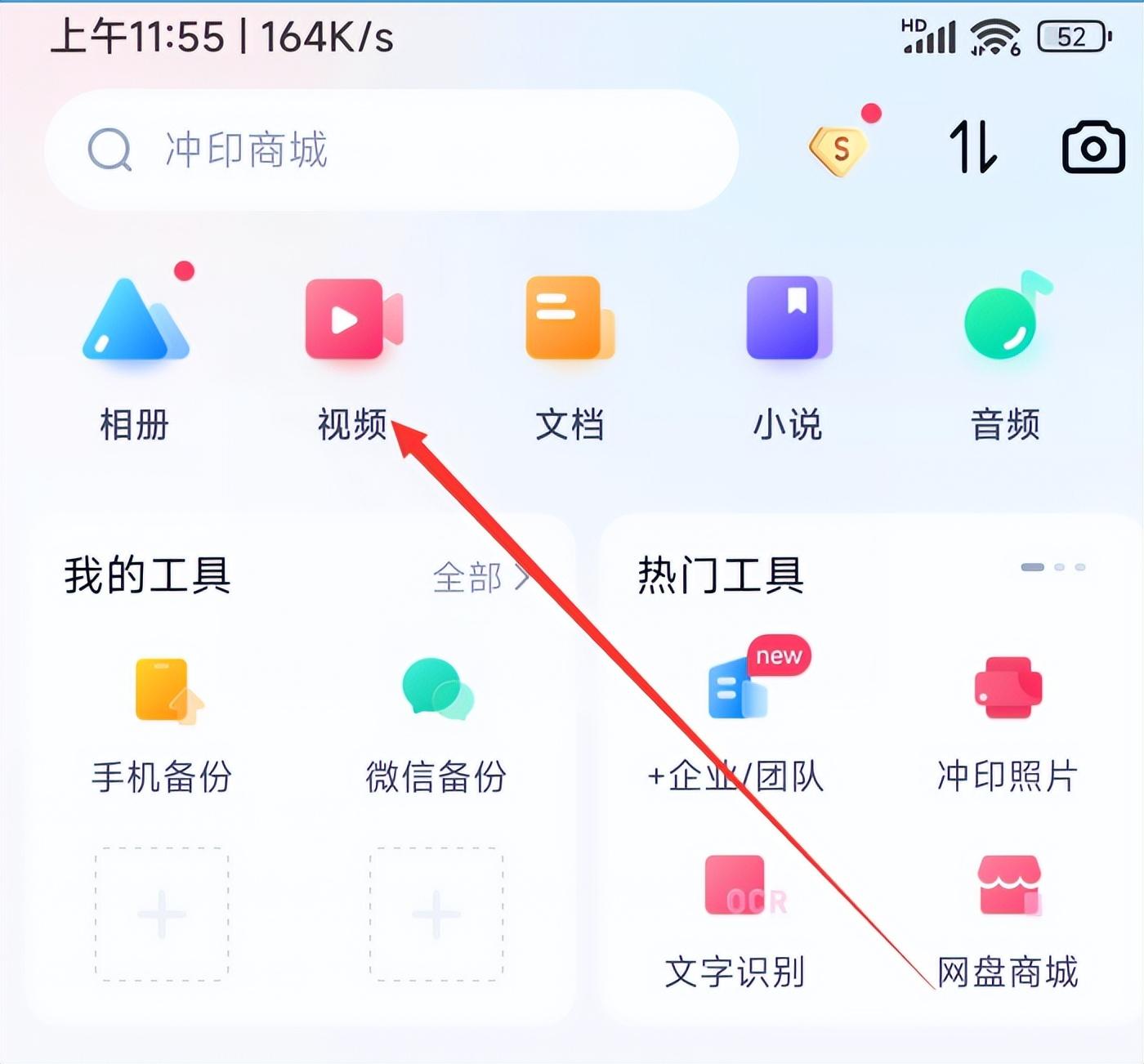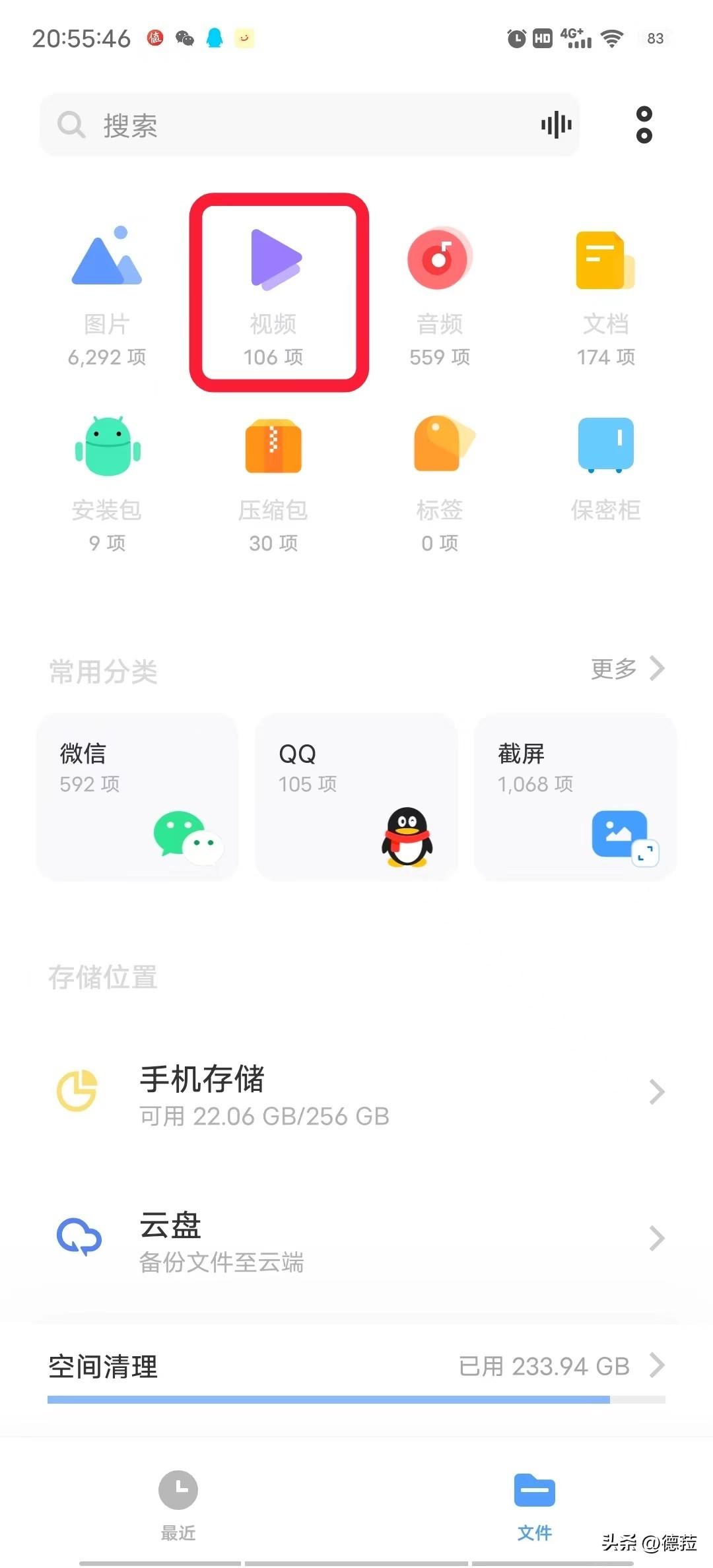 2、在应用中点击“视频”找到想要保存的视频文件。