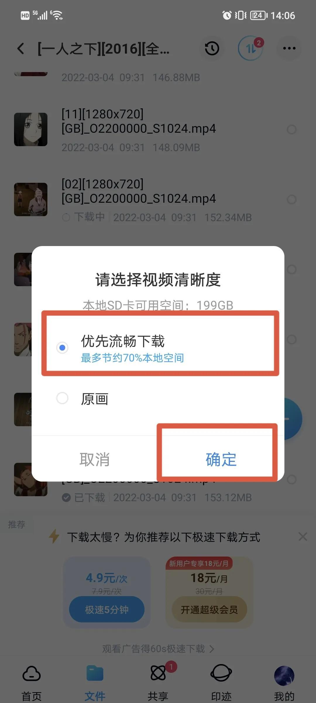 2.勾选需要保存到手机相册的视频。点击下方的下载选项,选择需要下载的清晰度。