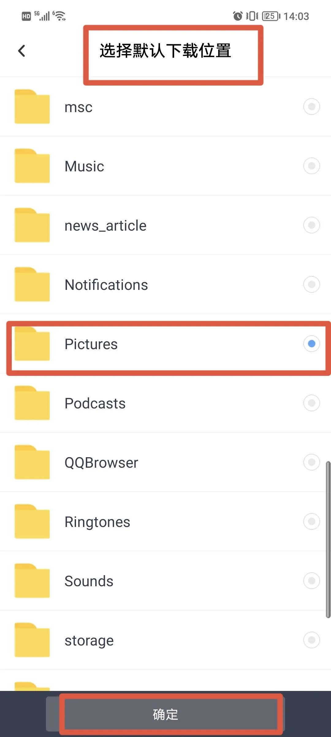 2.修改默认下载位置为Pictures,有的是Camera,点击确定。