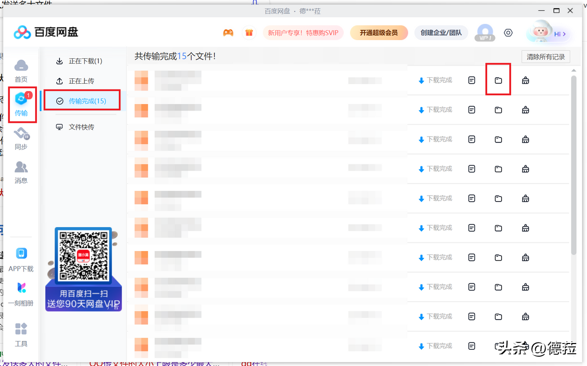 1、打开百度网盘电脑端,找到要保存的视频,点击下载,等下载完成后,打开“传输”,选择“传输完成”,找到要保存的视频,点击视频那一行如下图的文件夹