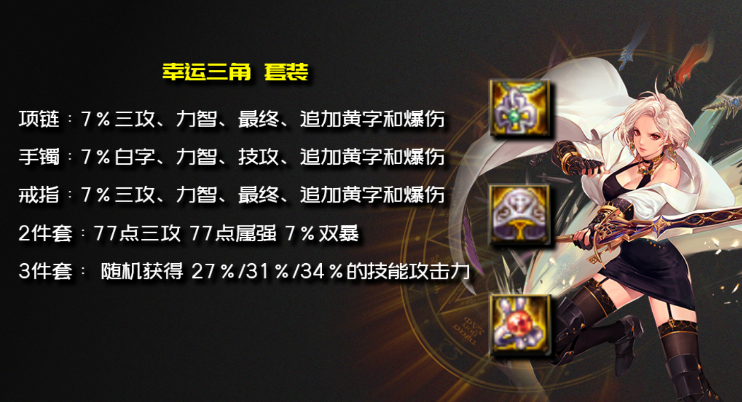 首饰选择幸运三角 ,这一套史诗首饰唯一的缺点是输出不稳定 ,因为三件套触发的技能攻击力是随机的,27%的几率是50%的触发概率,但是即使是27%的技能攻击力加成,这一套非常全面的史诗首饰爆发输出还是最高的。