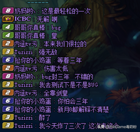 本来伤害不足的漩涡野团就凭借着BUG宗一路秒过了,而队员的对话也是十分国服特色:“BUG封三年,不会错的”“你这伤害,心悦8都解释不清楚”。