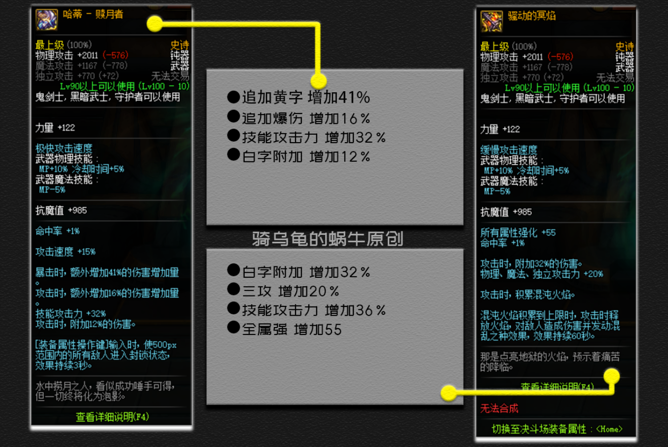 32%的白字附加,提升率为32%/(1+23%)=26%20%的三攻,提升率为20%36%的技能攻击力,提升率为36%55全属性强化,提升率为55/(255+700/3)=11%综上,冥焰的总提升率为126%x120%x136%x111%-1=128 %小结: 从提升率上来说,赎月者比冥焰更高 ,从手感上来说赎月者强于冥焰 ,并且冥焰的36%技能攻击力还需要叠加火焰才能达成,所以两把钝器的优先级别是赎月者>冥焰 。