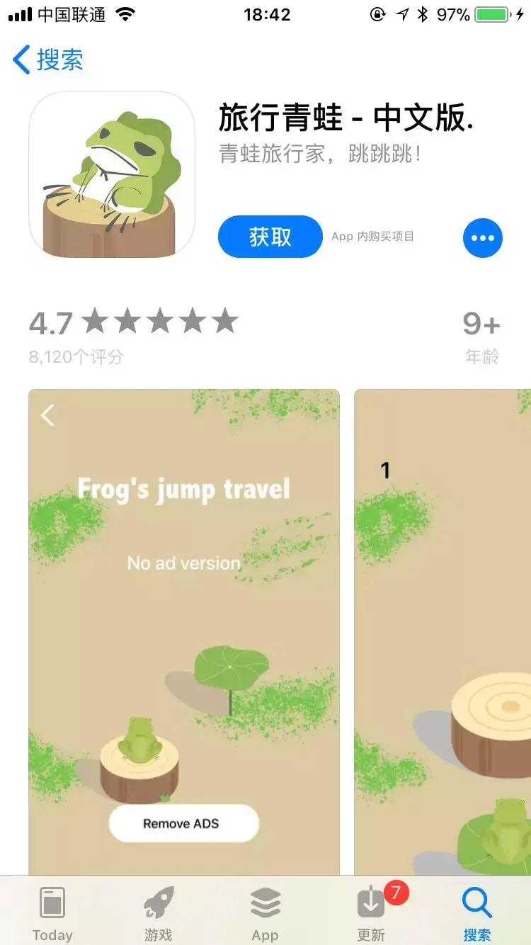 【 旅行青蛙 - 中文版. 】,排在第一,8120 个评分,平均 4.7 分,没毛病,应该就是他了!!