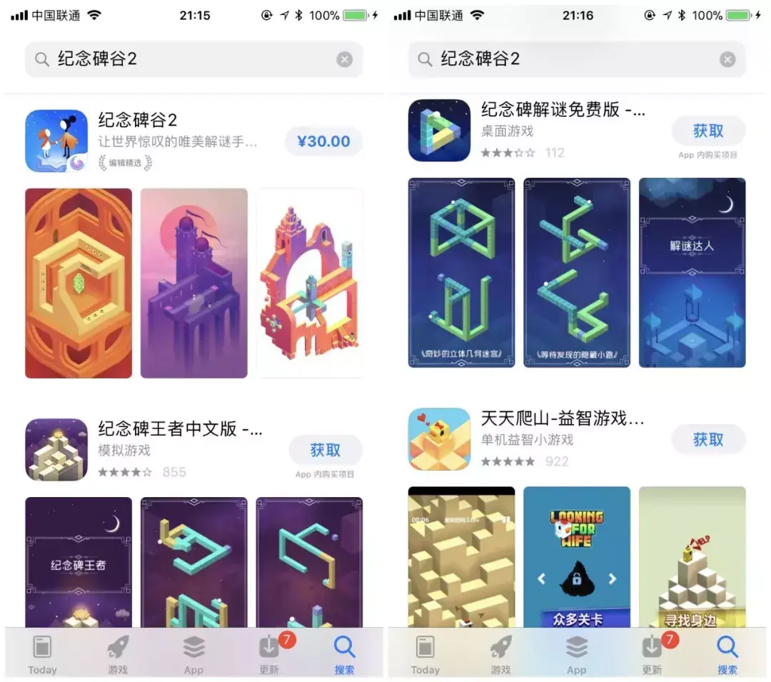 去年,《 纪念碑谷 2 》上线,当我们在 App Store 上搜索这个游戏时,也会冒出一大堆山寨版本,比如什么《 纪念碑谷 2 免费版之纪念河谷跳跃 》, 《 纪念碑谷解谜免费版 》。。