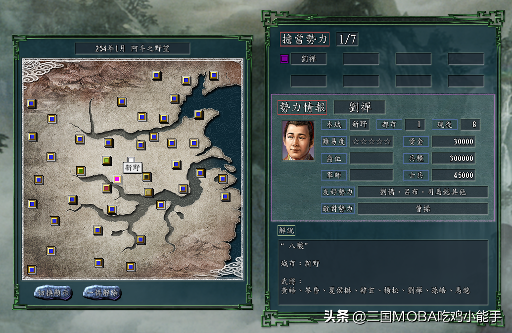 而这些剧本中,《阿斗之野望》就是一个非常有意思的剧本,顾名思义,这个剧本的主角是刘禅 ,在这个剧本中,阿斗是一个独立的势力,开局位于新野小城。势力下的武将特别拉胯,都是三国武将中五维属性倒数的8个人,分别是黄皓、岑昏、夏侯楙、韩玄、杨松、刘禅、孙皓和马邈,班底极为薄弱。