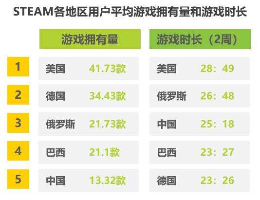 根据艾瑞咨询《中国PC单机游戏行业研究报告》显示中国steam用户平均游戏时长在全世界范围内处于一个很高的水平,但是用户的平均游戏拥有数量却只有12.32款,远远落后于平均游戏时长相似的俄罗斯(21.73款)和巴西(21.1款),更何况中国steam用户的消费潜力远高于前两个国家。