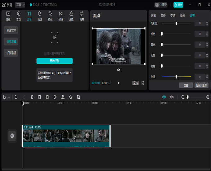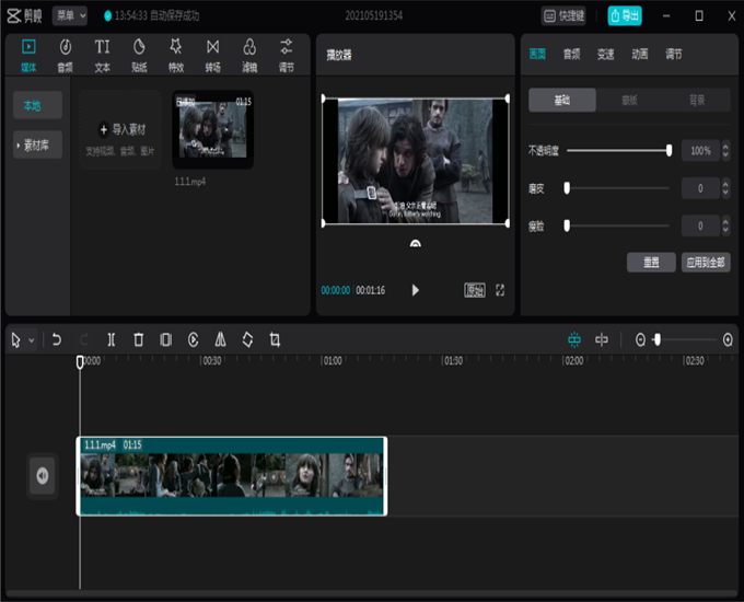 我选取了美剧权力的游戏的片段进行剪辑,从界面来看,剪映的界面简洁明了,贴纸、转场、特效、滤镜等在主界面查找方便,直接将素材拖拽到下方就可以进行剪辑。但当视频的时长大于30分钟时,加载时间较长会出现卡顿的情况。