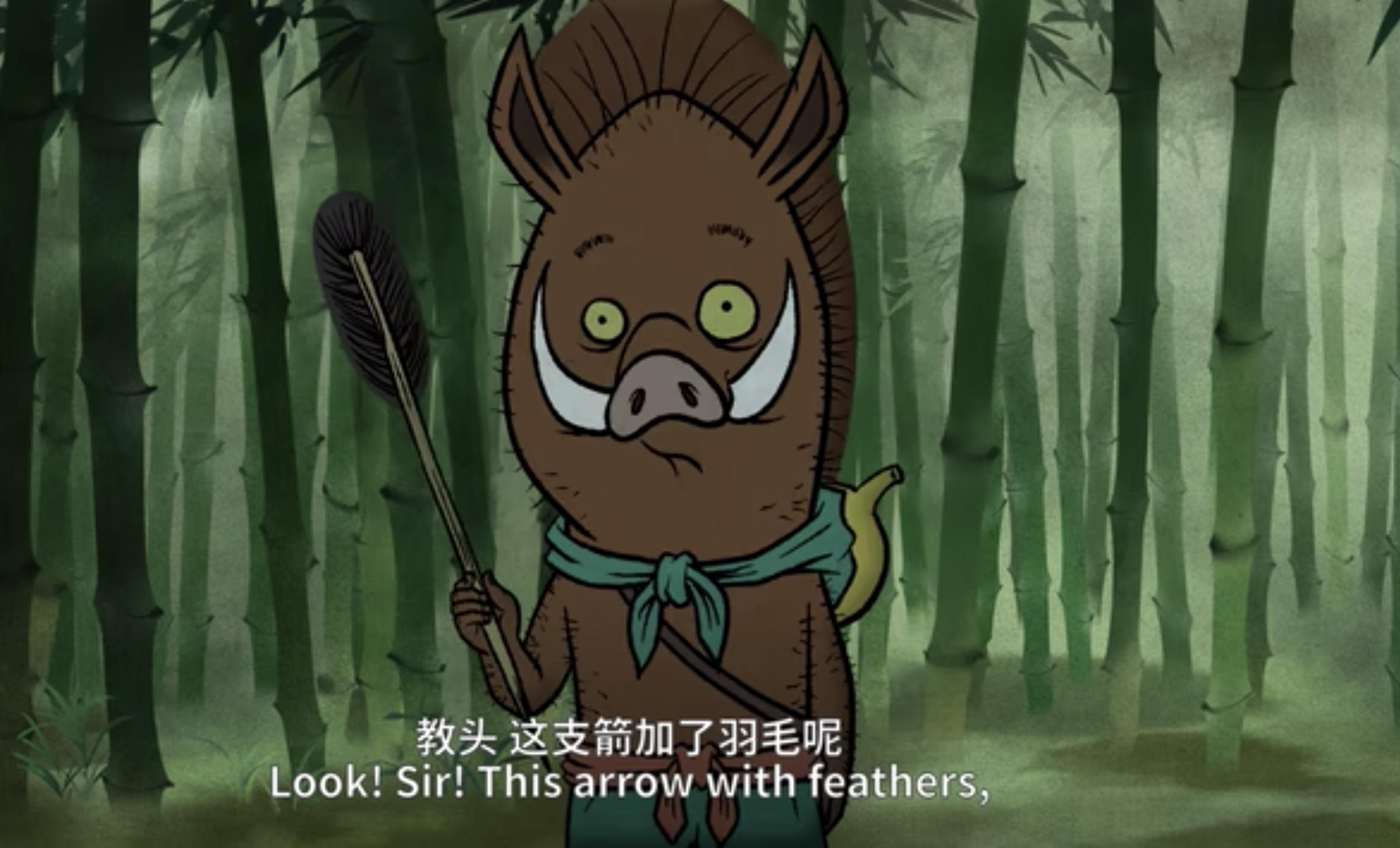 随后小猪妖扒光了乌鸦精的羽毛,做成了一百支羽毛箭,正当他兴致冲冲准备迎接熊教头的表扬时。却没想到,熊教头一看羽毛箭,勃然大怒,一把折断了所有的羽毛箭,并批评小猪妖为什么不按自己的要求做秃箭?