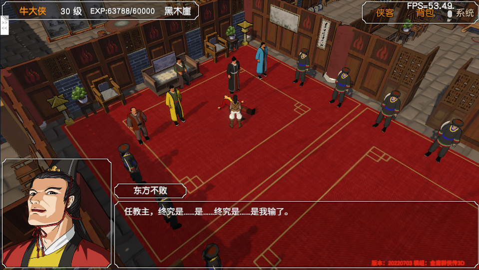 现在可取黑木崖了,把黒木令牌交给门口的守卫,到后面的房间触发战斗,本次战斗对象东方不败拥有绝学:葵花神功,是本游戏里最强的群攻技能,威力惊人。此时如果队伍中有空位,任我行会加入战斗。经过一番苦战,击败东方不败,获得笑傲江湖。此时再次跟任我行对话,可以抢夺葵花宝典。出黑木崖时遇到岳不群带领五岳剑派前来剿灭日月神教,击败即可。