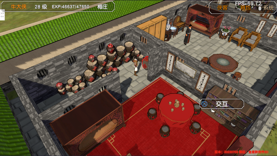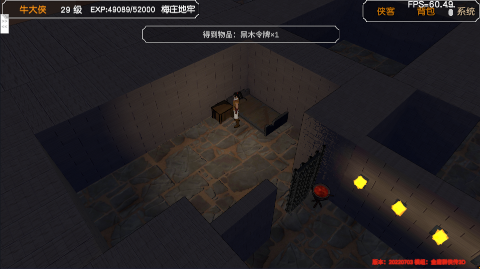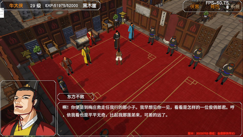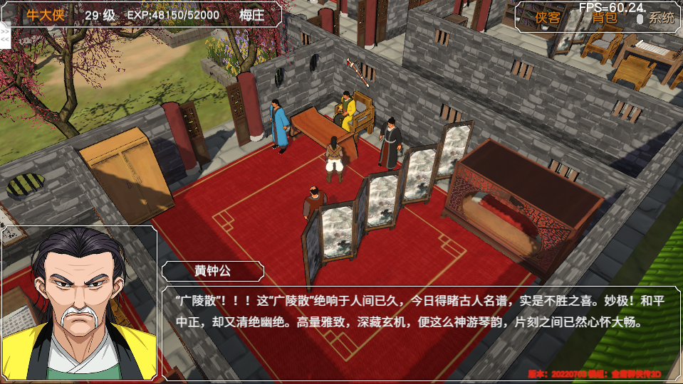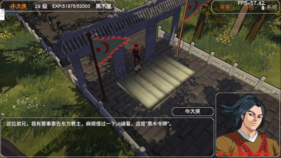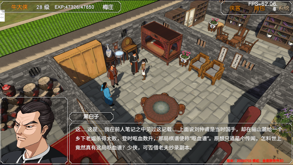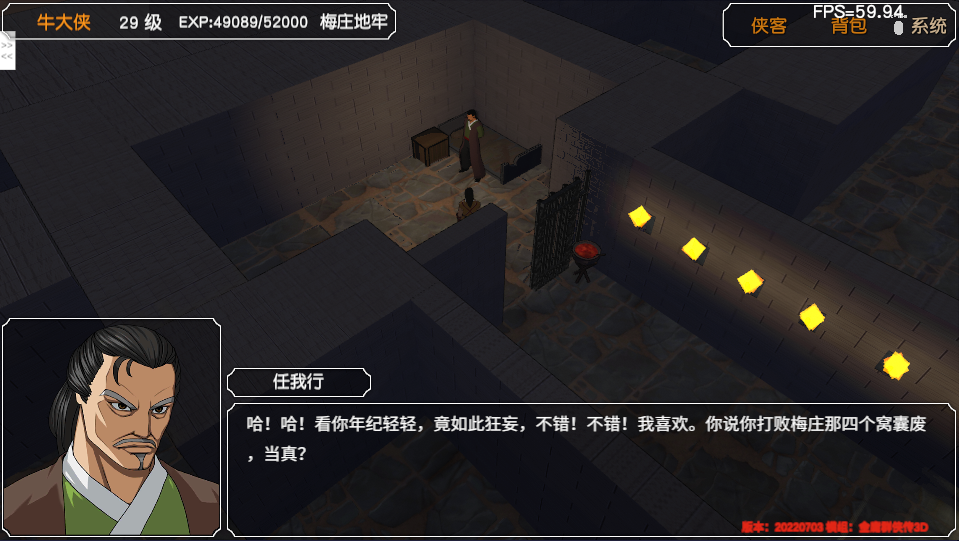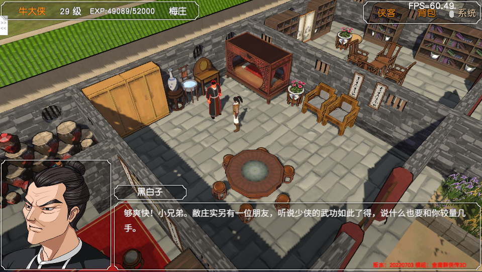 出门再进来,与二庄主黑白子对话,得到红钥匙,去后堂的密道,进入梅庄地牢,用红钥匙打开牢门,放走老怪任我行,记得拿床头的吸星大法和黑木令牌,此时可以去黑木崖了。出地牢后被四位庄主发现,无话可说战斗吧。