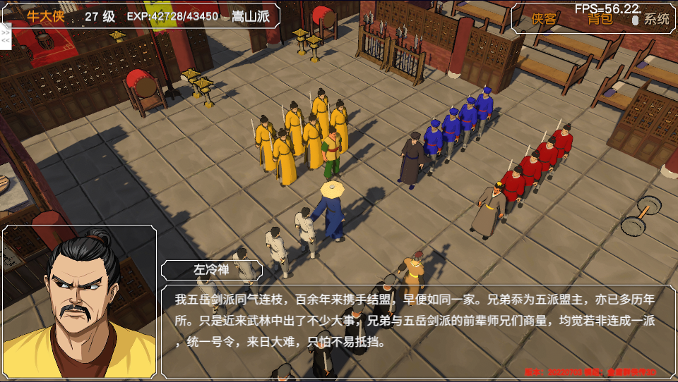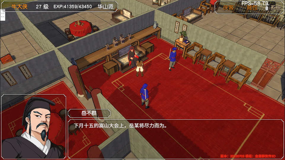 接下来到达西岳华山派,华山派岳掌门不愧为君子剑,挺有君子风范,君子动口不动手,这里不用打架了,听完岳不群的长篇大论就可以了。旁边的屋子里有金钥匙和紫霞秘籍,有兴趣可以拿走。