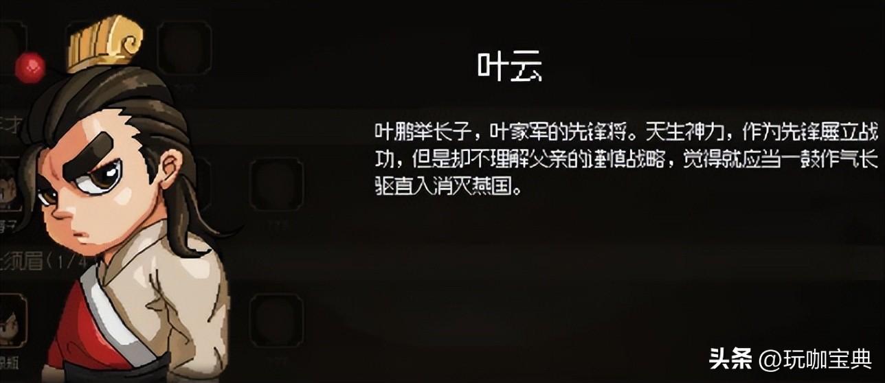 叶云的招募更简单,在叶家军大帐,只要带几个包子给他就能拉好感度,一路直接培养到60后拉进队伍,他虽然攻击范围不大,但高达56级,攻击力异常惊人,前期玩家打狼都很费劲,这哥们一招直接秒一片,有了他你前中期的剧情都能稳定杀,挂机等着云哥出手就完事了。