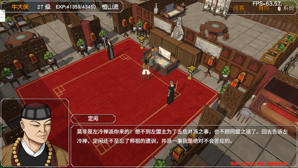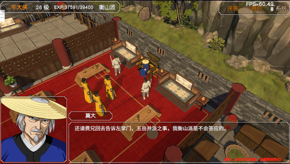 兜兜转转来到南岳衡山派,对门口弟子使用金盆洗手请帖,或者直接战斗也可以,进门看到嵩山弟子正在胁迫莫大掌门,等他们讲完,跟莫大掌门对话触发战斗,胜利后得到回风落雁剑秘籍,出门顺便解决几个嵩山弟子。