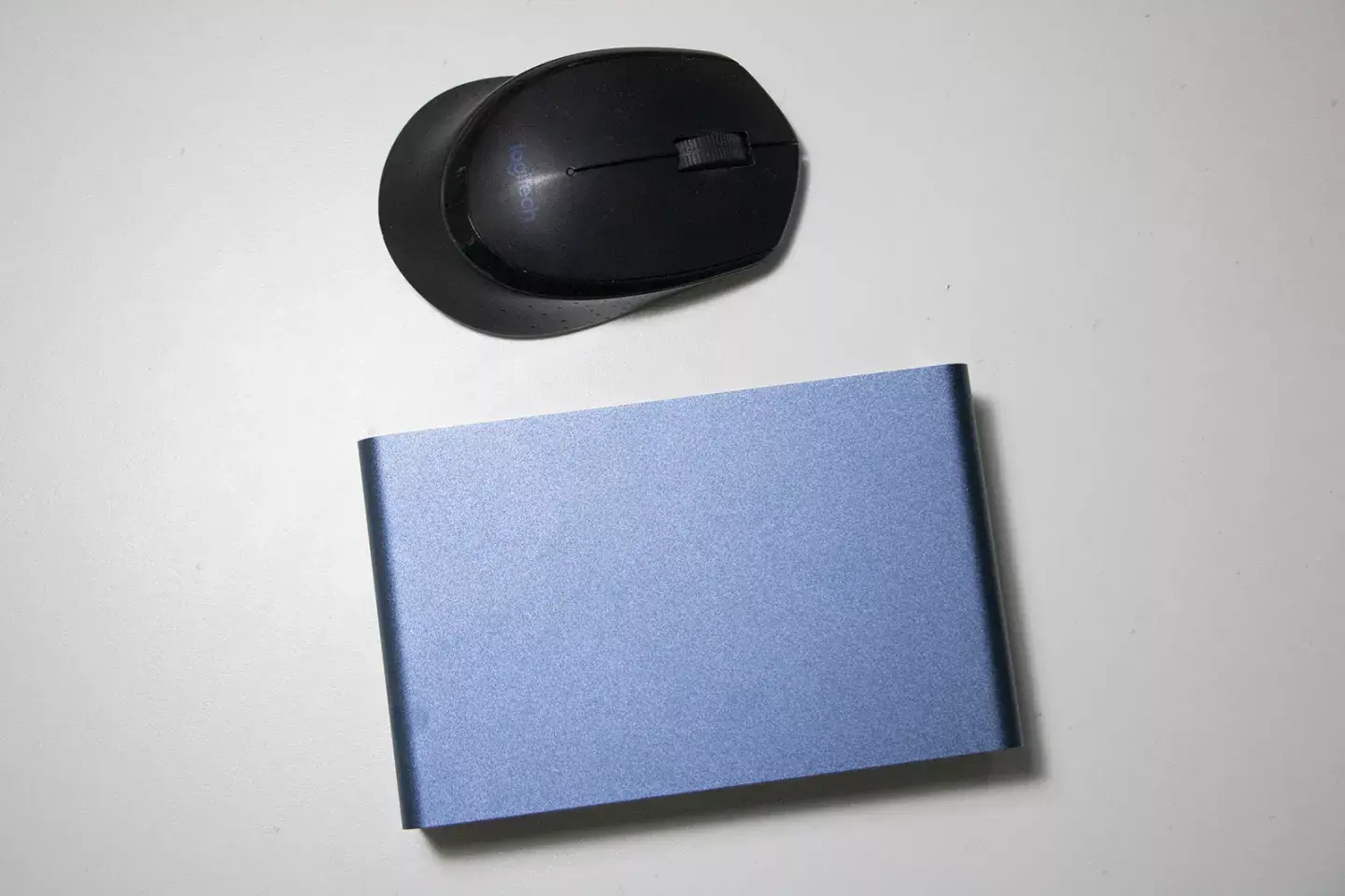 做工还是非常不错的,尺寸非常小巧,我这款是蓝色的,金属机身,和鼠标对比,很小巧吧,侧边没任何接口,全是蓝色金属机身面板~