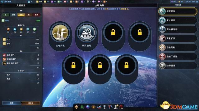 文明界面用于查看当前文明的状况概要,也能直接查询具体资源的来源与数量。