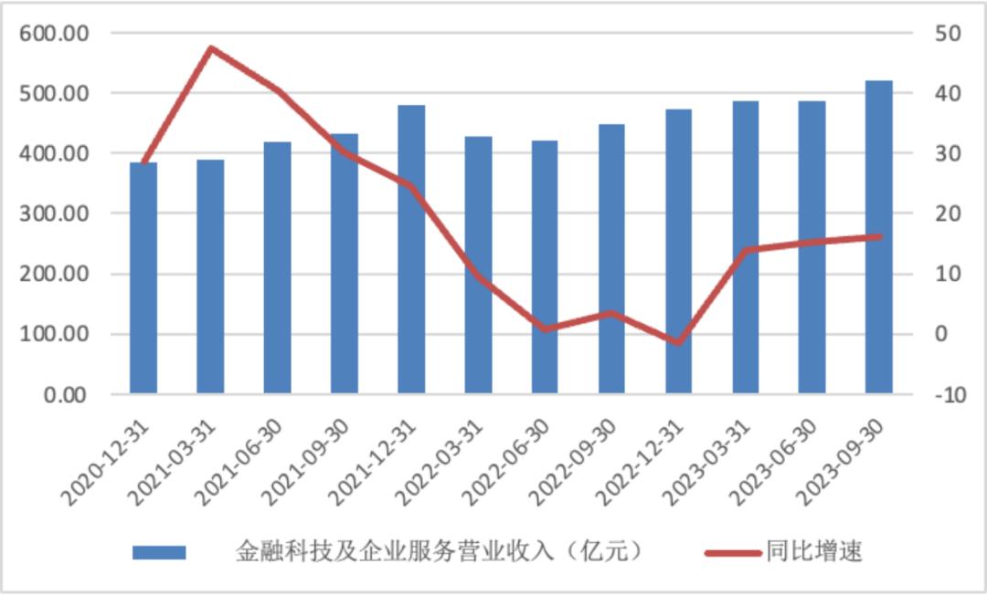 图:金融科技及企业服务营收及同比增速 数据来源:Wind、36氪整理