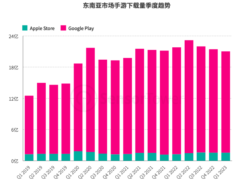 不仅仅是国内市场,电竞手机在海外短期内仍是一个难以迅速起量的市场。以东南亚地区为例,随着近几年国内游戏手机厂商纷纷出海,今年一季度东南亚市场手游下载量虽有所回落,但仍高于2019年同期水平。