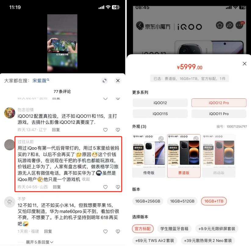 在社交媒体平台上有iQOO用户说道,iQOO 12 Pro 16GB+1TB的售价高达5999元,其价格接近华为Mate60 Pro,但Mate60 Pro却有盘古大模型、卫星通话等一系列功能,而iQOO却只是一部游戏手机。