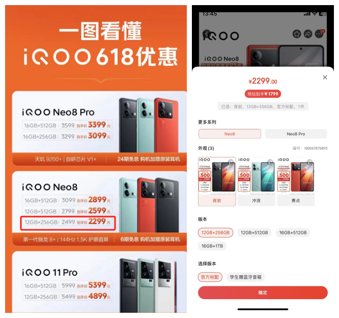 不仅如此,近两年iQOO新机价格跳水严重。以iQOO Neo8为例,其标准版12GB+256GB今年618和双十一价格分别为2299元和1799元,部分vivo经销商门店,双十一价格更是拉到1700元以下。换句话说,Neo不到半年的时间内价格下跌超500元。