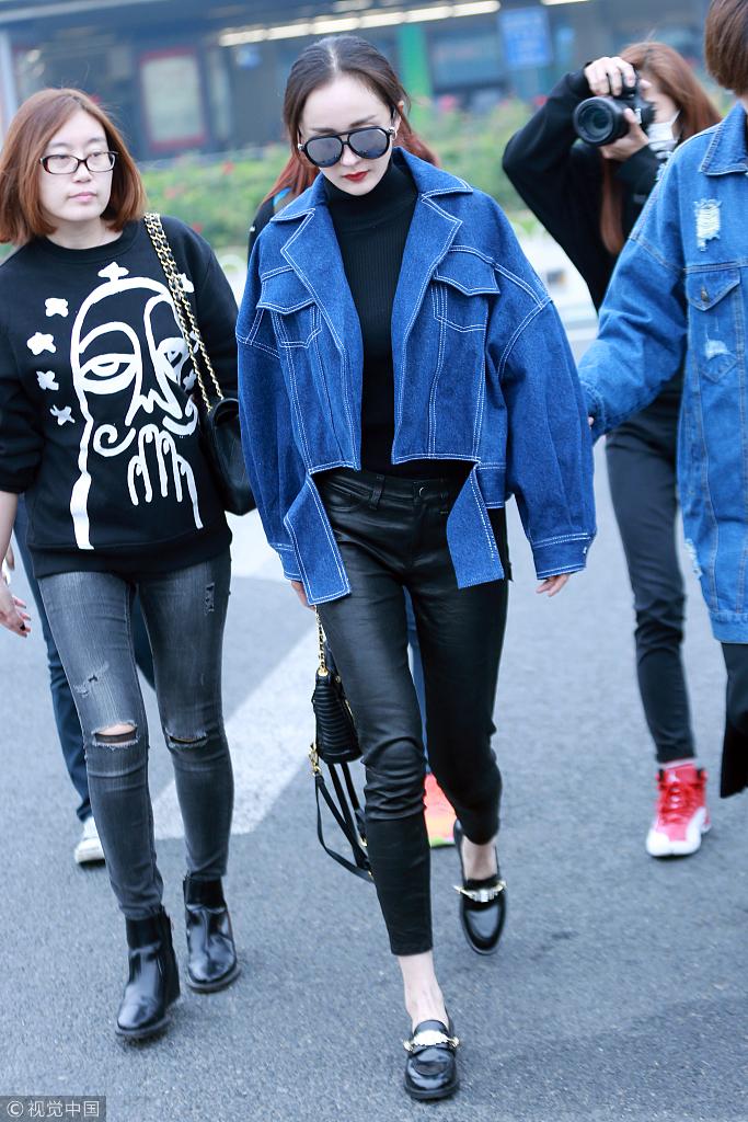 廓形牛仔外套的风潮也是杨幂最先带起来的。黑色复古飞行员太阳镜遮面,一件非常抢眼的廓形牛仔外套,内搭黑色高领上衣,下身搭配黑色紧身九分皮裤,牛仔与纯黑的一身穿搭,酷到没朋友,难怪会受到追捧。