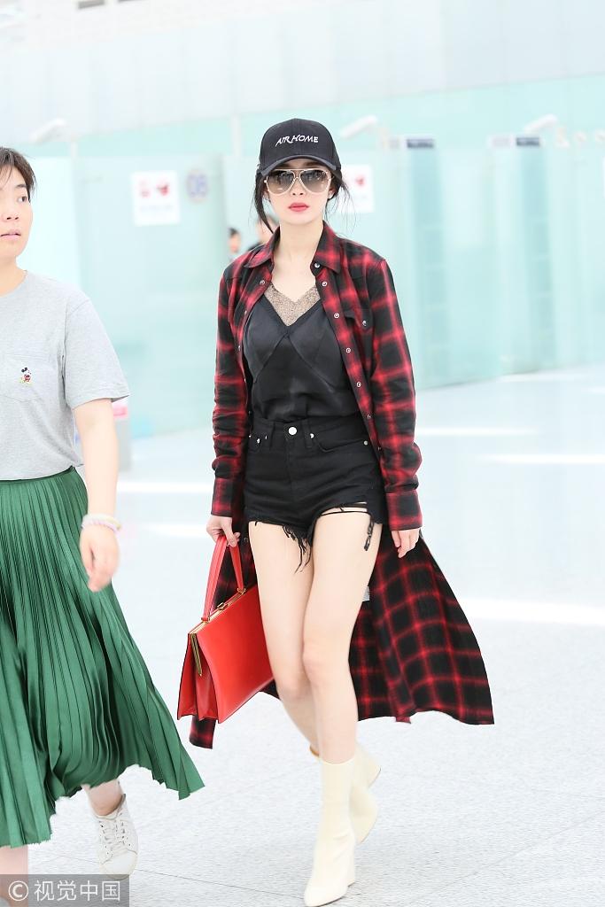 其实格纹衬衫穿不好很容易Low,在款式、颜色的选择以及整体造型搭配上杨幂总能让人眼前一亮。例如在穿这件长款格纹衬衫时,她头戴白色字母刺绣鸭舌帽,内搭黑色缎面蕾丝拼接上衣,下穿一条普通的毛边热裤,靠一双白色高跟短靴和Celine红色Clasp包来提升气场,成为很多女生追逐的着装风格。
