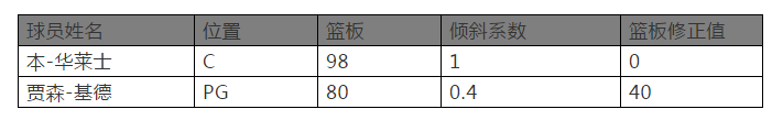 即单项实际属性=二级属性配值*位置倾斜系数+修正值,下表中司职控球后卫,职业生涯却能场均6.3个篮板的贾森-基德显然需要一个修正值。而两届篮板王(2001-2002,2002-2003)本-华莱士则不需要这种修正。