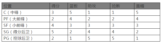举个栗子:按照球员的位置和篮球运动中主要的五大技术统计,可以做一个简单能力的权重分布,重点是要找到一个基准,即所谓的“平均球员”。在现实中,效力于金州勇士队的克莱-汤普森几度被NBA联盟评选为平均先生,我作为汤神的铁杆球迷其实是挺无奈的,因为这说明他身体条件不出众。但游戏中通常习惯选择小前锋(SF)作为属性数值的基准:
