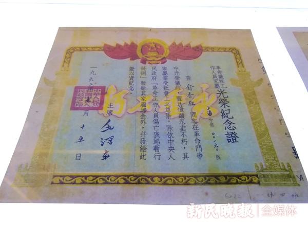图说:毛泽东为俞秀松烈士签发的光荣纪念证
