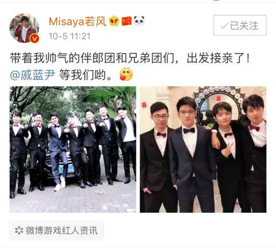 10月5日,英雄联盟WE战队前队长若风在微博公开了自己和伴郎团、兄弟团的合照,艾特了戚蓝尹:“带着我帅气的伴郎团和兄弟团们,出发接亲了!等我们哟” 自“锤成婚。