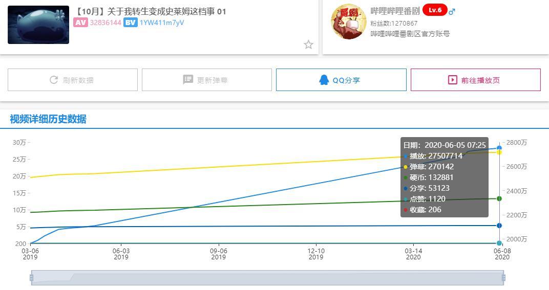 《关于我转生变成史莱姆这档事》发行量包括漫画就有450万,平均37万;动漫番剧在BBiliBili评分9.4,追番人数达565.6万,总播放量突破2.6亿次,