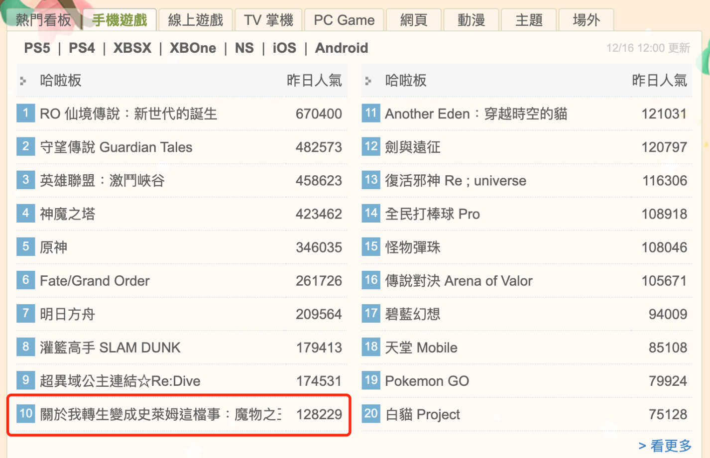前期,《转生史莱姆》手游在巴哈姆特上的运作以新闻曝光为主,偶尔会有一些同人作品、Cosplay,以及玩家的讨论内容出现。随着游戏上线时间的迫近,相关的内容曝光也愈发频繁,这些都为游戏在论坛上持续积累着热度,公测开启后,《转生史莱姆》手游在巴哈姆特上的热度迅速冲到了前排,安卓成长榜第一,热门看板和手机游戏板块也都进入了首页前20名。
