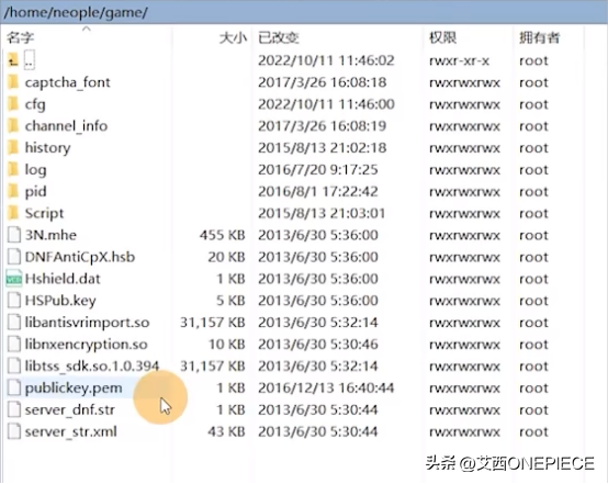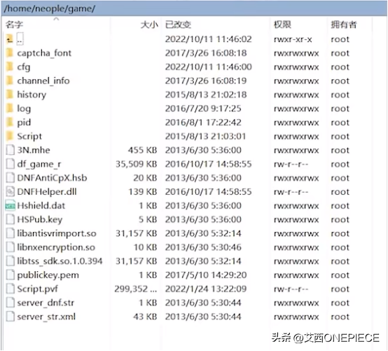 根据各自服务端寻找对应路径上传文件(等级补丁、密钥、版本PVF),并选中三个文件鼠标右键→属性→给0777权限