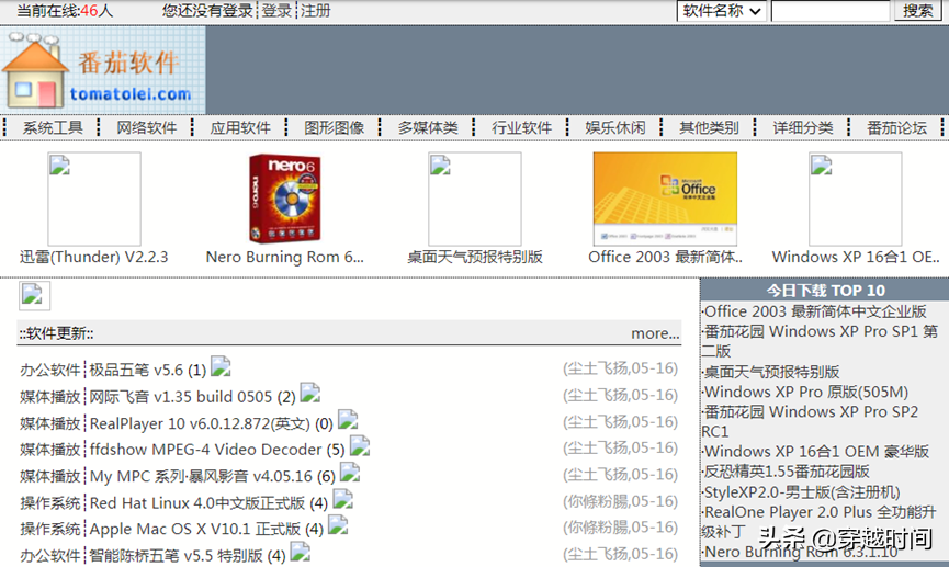后来,洪磊开始制作WindowsXP操作系统,也就是自己修改设置的盗版系统。其实微软WindowsXP系统的安装原理并不复杂,只要依照安装程序inf文件的运行逻辑,就可以实现安装过程的调整。但番茄花园网站上列出的不仅有系统软件,还有各个类别的应用软件,在下面这张图片里,我们可以看到“系统工具”、“网络软件”、“应用软件”、“图形图像”、“多媒体类”等各个类目,俨然一个免费的软件下载站点,右侧今日下载TOP10中,Office2003最新简体中文企业版、番茄花园WindowsXP Pro SP1第二版赫然在目,这些软件都是侵权盗版的。