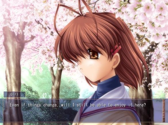 在某个小镇,主角冈崎朋也因为家庭的因素成为不良少年,一直与春原阳平为伍,在光坂高校过着潦倒的生活,但冀望终有一天能够离开所在的小镇。某年4月14日,他在学校坡道前发现了一个止步不前的女孩,在朋也认识了这个名为“古河渚”的女孩后,他的生活开始有了重大的变化。