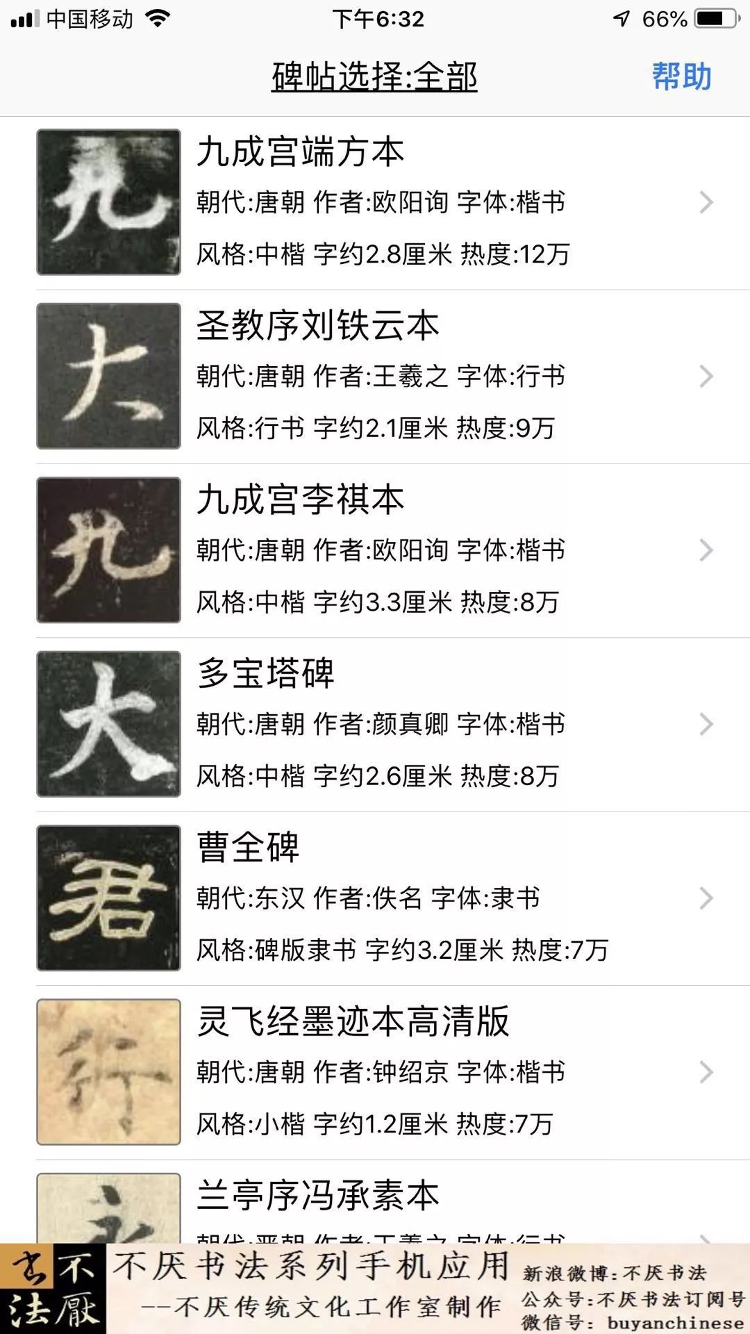 字帖热度排序。碑帖选择,在首次进入应用以及后续换书时,可以通过碑帖选择页选择一本目标学习碑帖。字帖种类多,会有字帖原帖大小以及每个字的大小。