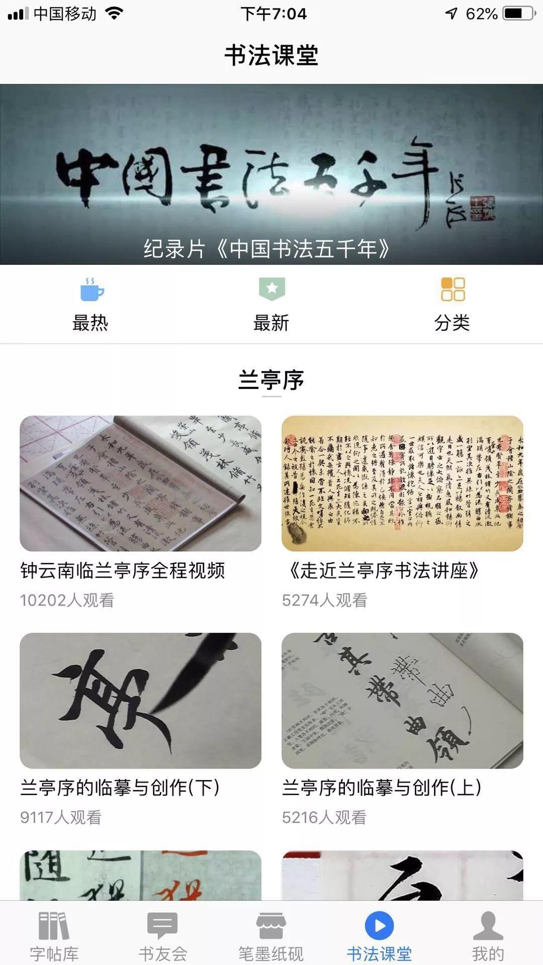 有一系列书法课堂,可以观看视频学习书法。