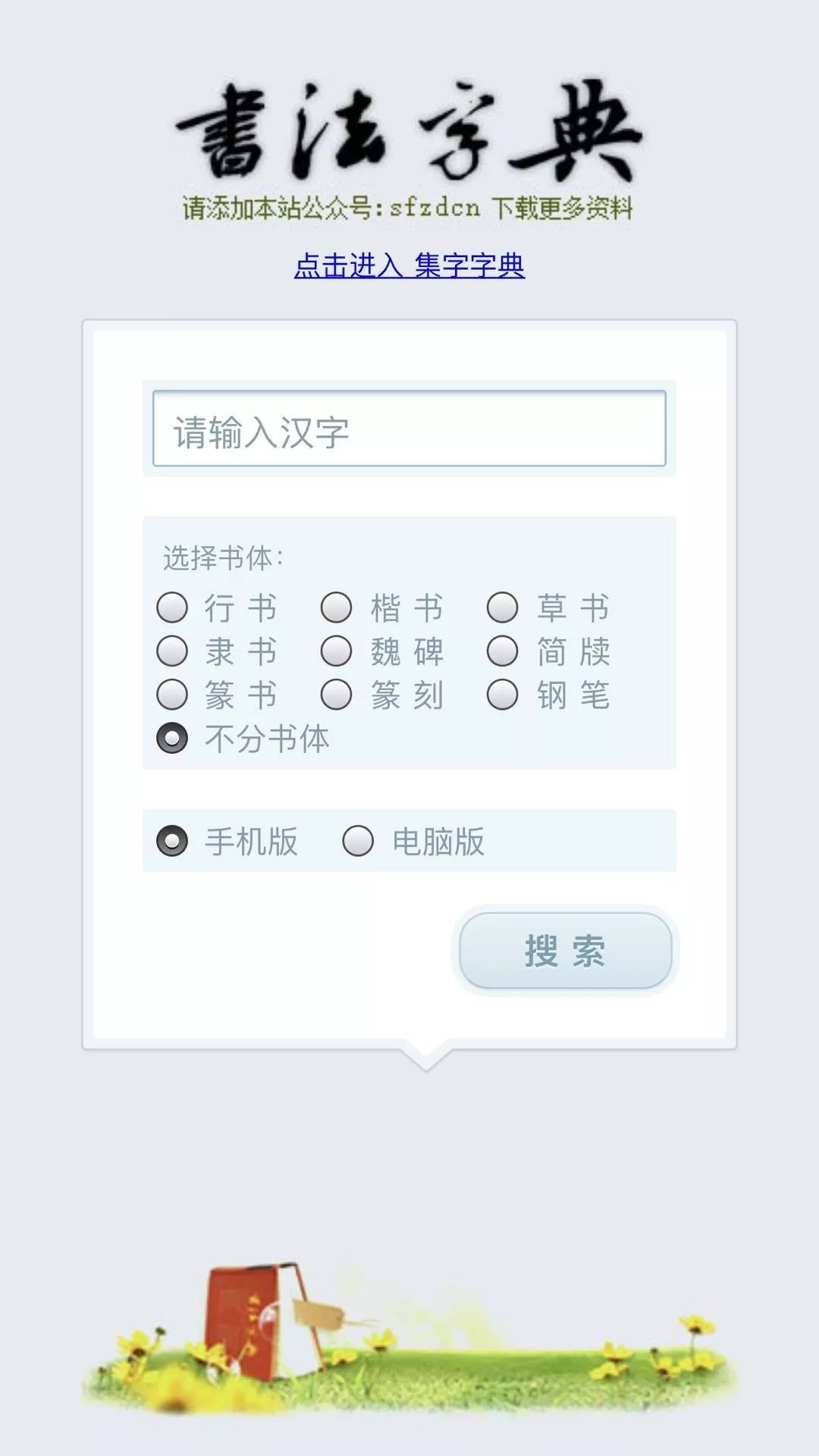 有字典和集字两种。在集字中可以一次性集多个字,其中还有常用字和楹联的推荐。