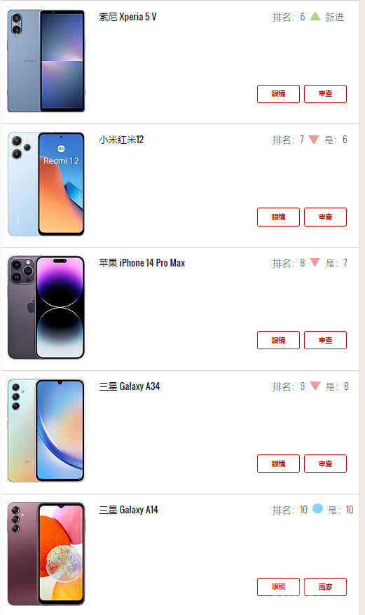 紧随其后的是三星S23 Ultra、红米Redmi Note 12 Pro,分别排名第三、第四;Redmi Note 12排名第五;索尼Xperia 5 V排名第六;Redmi 12排名第七; 苹果iPhone 14 Pro Max排名第八;排名第九、第十的分别是三星A34、三星A14。