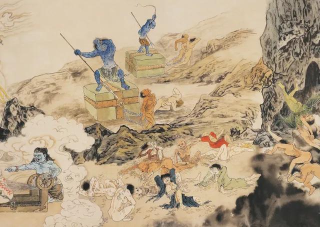 关于这个地狱,我上网查了一下,大体意思是这样的,黑绳地狱的狱卒捉住堕于此地狱的罪人们,放在滚热的铁台上,再将其身体完全舒展开来,根据他们生前的罪孽分别被热铁绳捆至八、十六、三十二段不等,再用炽热的铁锯或铁斧按照黑绳捆绑的路线切割屠砍,以此来洗去罪恶之身,但由于罪孽深重,死去的罪人会再度复活,周而复始,直至还清罪孽为止 。