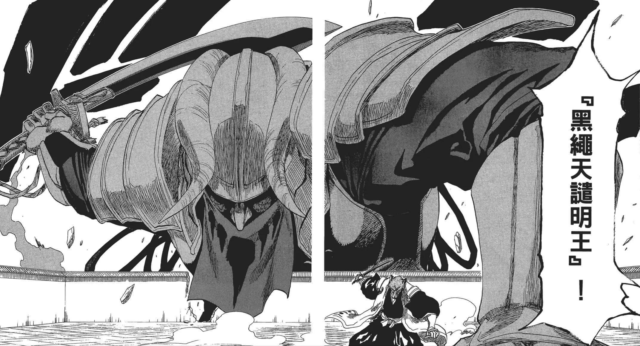 经由狛村人化,黑绳天谴明王的形象也发生了大幅度的转变,变化为“断铠绳衣” ,明王褪下铠甲,以真实的躯体来作战。