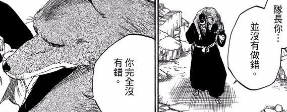 补充一下,狛村因为人化之术的副作用,彻底化作了狼躯,而这时射场出现,并对狛村说道:“队长你并没有做错,你完全没有错”。