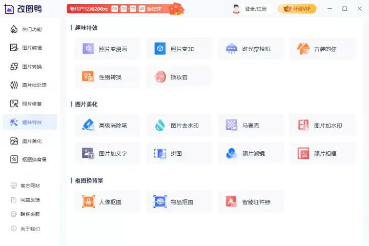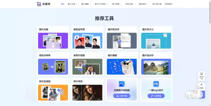 一个很有意思的图片编辑工具网站,有许多好玩又实用的图片编辑工具可以免费使用,可以给照片加特效,修复老照片,照片变漫画,图片变清晰、性别转换等等,功能还挺多的,好玩又好用