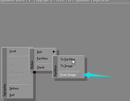 1。重新启动计算机,快速按F8键进入DOS界面,运行g.exe进入ghost界面,如图所示,选择菜单到本地(本地)-分区(分区)-从图像
