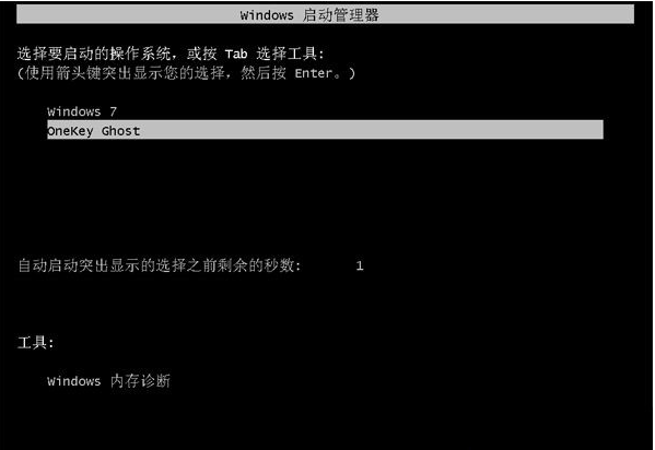 5、这时我们自己的电脑重启,电脑启动项空出OnekeyGhost,可以默认设置选择此功能进入。