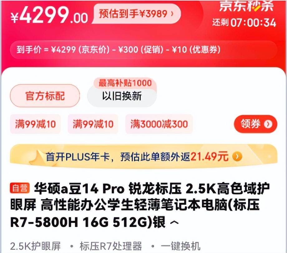 ② 华硕 a豆 14Pro 锐龙版 16+512GB 参考价:3999 元