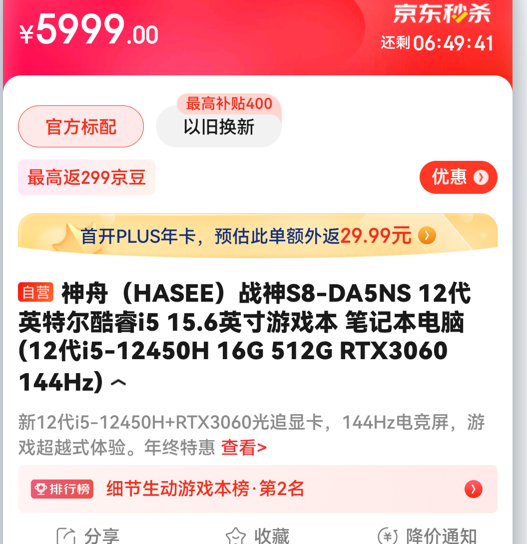 ② 神舟 战神 S8-DA5NS 16+512GB 参考价:6000 元
