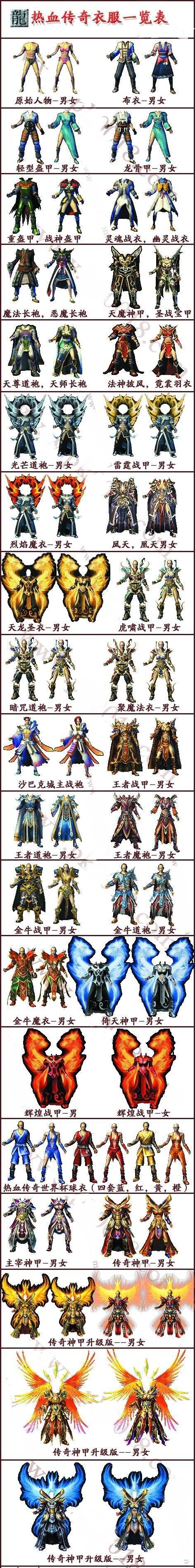 这里收录了传奇所有的衣服,分别是布衣,轻盔甲,重盔甲,战神盔甲,灵魂战衣,幽灵战衣,魔法长袍,恶魔长袍,天魔神甲,圣战宝甲,天尊道袍,天师长袍,法神披风,霓裳羽衣,光芒道袍,雷霆战甲,烈焰魔衣,凤天魔衣,凰天魔甲,天龙圣衣,虎啸战甲,暗咒道袍,聚魔法衣,城主战袍,王者魔袍,王者战甲,王者道袍,金牛战甲,金牛魔衣,金牛道袍,倚天神甲,辉煌神甲,热血球衣,主宰神甲,传奇神甲。